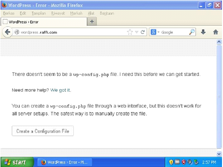 - Buka browser di client, lalu cari ⦁ http://wordpress.nama(raffi).com. Lalu akan muncul seperti gambar dibawah. Lalu klik “Create a Configuration File” lalu ikuti perintah selanjutnya. Anda akan membuat username dan password.