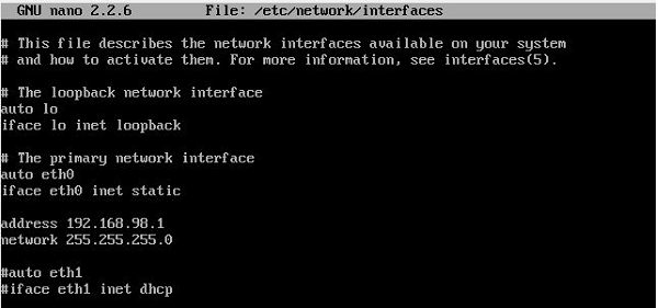 - Selanjutnya konfigurasi IP address dengan perintah “nano /etc/network/interfaces” lalu edit seperti dibawah.