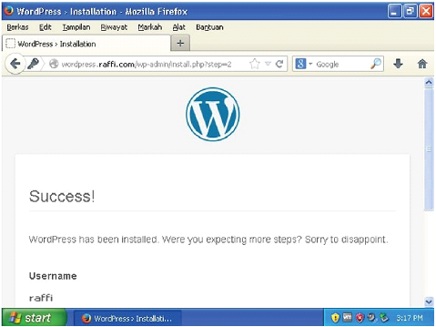 - Jika semua langkah berhasil maka akan muncul tampilan seperti gambar dibawah dan proses installasi CMS sukses.